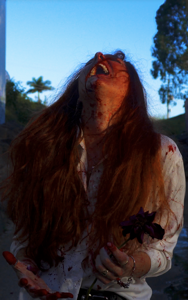 A hand with bloody fingers holding a dark, wilted rose upright in a shallow creek with buildings and trees in the background.
